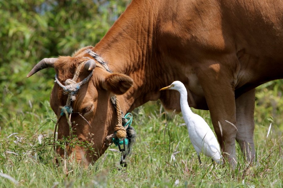 사진 : 국립공원연구소 황로는 소가 풀을 뜯어 먹을 때 다가와서 풀 사이의 벌레들을 잡아먹는 다고 한다. 소의 입장에서는 별 이익이 없지만 피해도 가지 않기 대문에 같이 잘 지내는 공생관계라고 한다. 크게 신경 안쓰고 벌레 먹도록 놔둔다는 것이 포인트.
